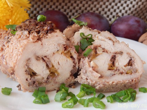 Гости на пороге, надо скоро и прекрасно накрыть на стол. Нас может выручить простая куриная грудка. Мясо курицы готовится весьма скоро. Оно питательно и не содержит вредных для организма человека сал. Не зря курятину рекомендуют деткам и нездоровым людям. Я хочу предложить вашему вниманию рецепт куриного рулета со сливами. Если нет слив, можно использовать любую понравившуюся вам начинку. Мясо курятины лучше хватать не заледенённое, оно должно быть упругим, нежно — розового краски. От качества мяса зависит питательная ценность блюда. Филе необходимо слегка отколоть, притрусить специями, начинить, чистоплотно свернуть, запечь. Куриный рулет со сливами удивит ваших родимых своим утончённым вкусом и волшебным ароматом. Для приготовления куриного рулета со сливами нам потребуется одинешенек час, количество порций – 2 порции. Ингредиенты: Куриная грудка – 500 грамм Сливы – 2 штуки Масло растительное – 20 грамм Грецкий орех – 50 грамм Чеснок – 1 зубчик Соль – 0,5 чайной ложки Семя кунжута – 30 грамм Смешение перцев – 0,5 чайной ложки Этапы приготовления рулета из куриной грудки: Половину куриной грудки недурно промываем под проточной водой и просушиваем на бумажном полотенце. Затем чистоплотно разрезаем вдоль, не дорезая до крышки. Разворачиваем и слегка отбиваем. Чтобы не повредить мясо, его можно сервировать пищевой пленкой. Затем притрушиваем смешением перцев и солим.