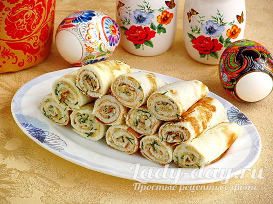 Если у вас остались блинчики тогда можно использовать их для этой закуски и не заморачиваться с приготовлением новоиспеченных.