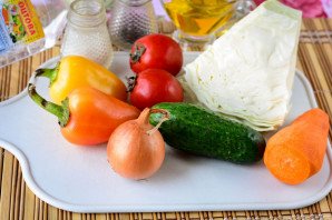 Полейте маслом и перемешайте, оставьте на столе на пару часов, овощи впустят сок.