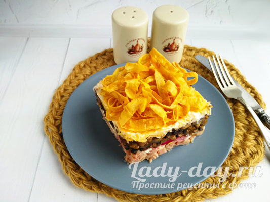Пикантность салату по этому рецепту с пошаговыми фото придаст небольшое число гранулированного чеснока, он даст лёгкий деликатный запах поджаренными грибам. Для заправки понадобится смесь домашнего майонеза и классического йогурта. Для пропитывания салата потребуется пора, учитывайте это при планировании подачи.