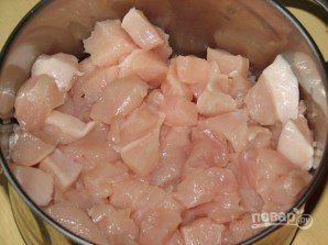 Куриное филе нарезаем небольшими кусочками.