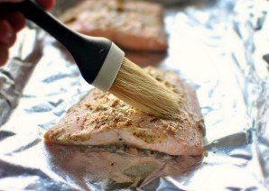 Промываем филе семги. Сваливаем его на фольгу и смазываем со всех сторон оливковым маслом, а затем горчицей. Заворачиваем в фольгу и запекаем в духовке до готовности.