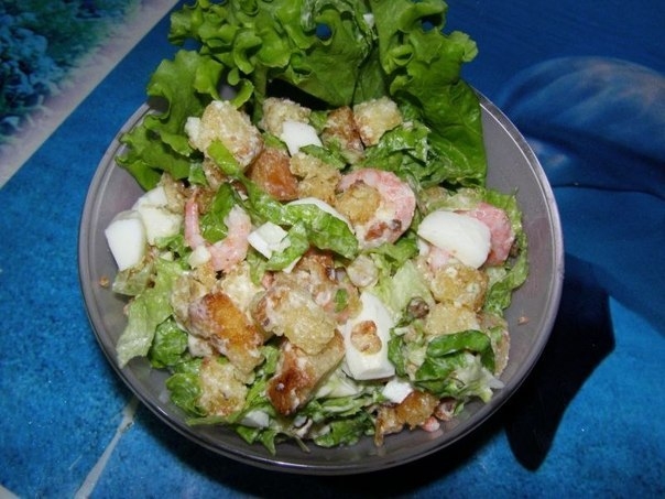 Скопить салат: обжаренные сухарики, листья салата, яйца, порезанные крупно, почищенные креветки.