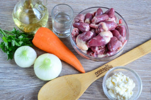 Подготовьте все необходимые ингредиенты. Вскипятите в кастрюле воду и пошлите в нее куриные сердечки (предварительно промойте их под холодной водой), варите сердечки в течение 20 минут, посолите по вкусу.