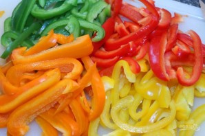1. Болгарский перец мою, затем вырезаю плодоножку и разрезаю любой на 2 части, вычищаю семена и перепонки. Нарезаю перец ломтиками. Лук очищаю от шелухи и мою, затем нарезаю его полукольцами.