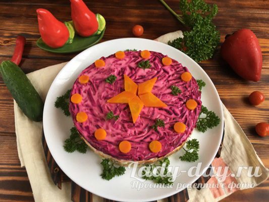 Салат «Генерал» готов! Осталось только его украсить. Я в этот раз решила в серединку салата выложить звезду, какая блестит на погонах генерала.