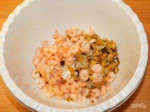 Грибы мелко нарежьте и обжарьте с луком. Остудите. Соедините с креветками.