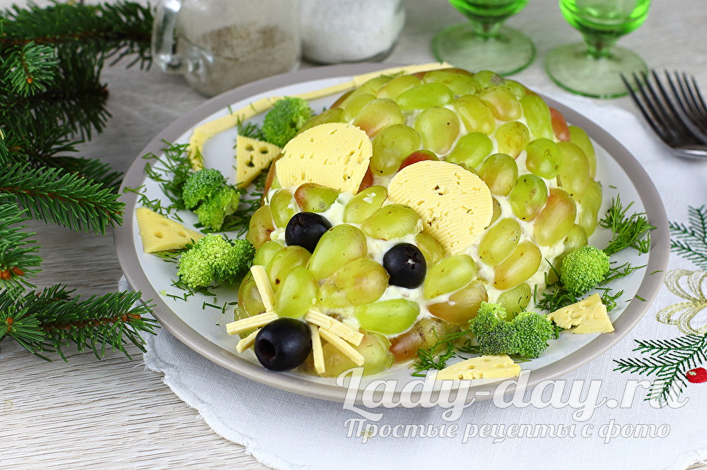 Виноград, лучше всего, использовать без косточки. Или разрежьте пополам и вышлете её. Половинки выложите плотно друг к другу на салат. Так как верх салата смазан майонезом, виноград не будет отваливаться. Из черноволосых оливок сделайте «глазки».