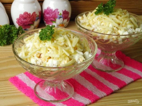 Для уменьшения калорийности салата можно использовать самый легковесный майонез или не жирную сметану. Перемажьте все слои и дайте салату немножко настояться, минут 10-15, но не дольше, чтобы сыр не успел заветриться.