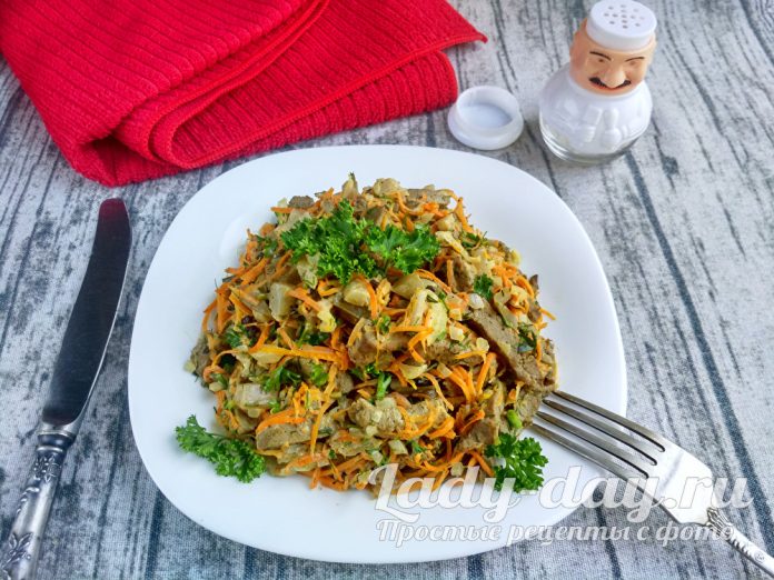 Салат имеет насыщенный печеночный вкус, дополненный добавками. Подайте к этому блюду алое сухое вино. Для диетического варианта выберите куриную печень и сметано-горчичную заправку. Для немало острого и нежного вкуса используйте свиную печень.