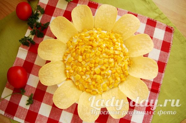 Салат «Ромашка» с чипсами получил свое наименование из-за внешнего вида. Он и правда очень напоминает ромашку – чипсы заменяют лепестки, а серединка делается из консервированной кукурузы, под какой прячется сам салат из рыбных консервов, яйца и плавленого влажна. В пошаговом рецепте с фото подробно рассказано, как сделать из несложных составляющих настоящий цветок, который украсит праздничный стол.