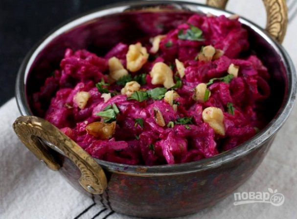 Этот вариант, как приготовить салат с черносливом и грецким орехом, неплох тем, что его можно подавать к столу и в салатнике, и в качестве закуски на здравицах, например. Запеченная свекла, в сочетании с сухофруктами и орешками — это подлинно потрясающе! В качестве заправки можно использовать как майонез, так и сметану.