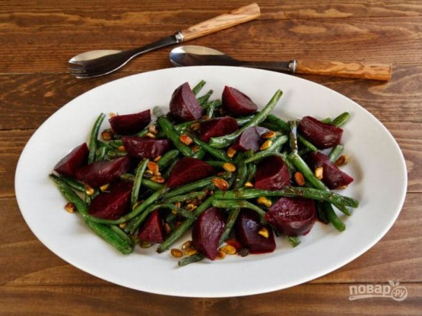 Недавно я разузнала о том, как приготовить салат с фасолью и свеклой. Обжаренные крупными кусами овощи понравятся вегетарианцам. Заправка очень простая, она лишь соединит все ингредиенты вместе и не перебьёт натуральный вкус. Оригинальной ноткой будут фисташки и мёд.