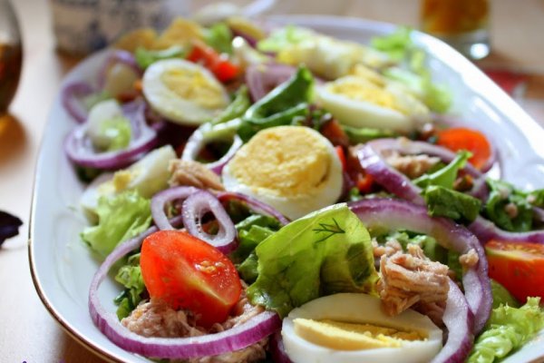 Перемешать, соль и молотый перец – по вкусу. Нарезать перстнями репчатый лук, вареные куриные яйца – небольшими ломтиками, консервированное филе тунца разобрать на кусочки.