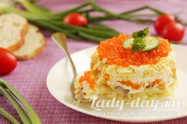 Если вы желаете удивить, советуем вам приготовить «Сельдь под шубой» с красной икрой. Такой вариант смотрится куда эффектнее варианта со свеклой. Да и вкус салата становится утончённее и интереснее. Конечно, это не бюджетный салат, недаром он даже называется «Селедка под дорогой шубой», но для праздника идеален. Как его стряпать, вас научит наш рецепт с пошаговыми фото.