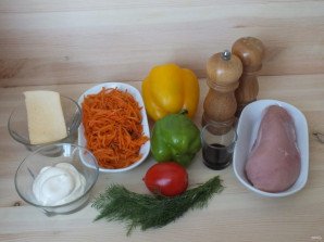 На куриное филе выложите слой из корейской моркови.
