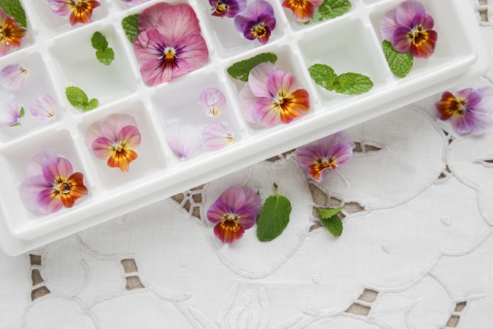 Листочки мяты и головки фиалки можно спустить в воду при заморозке кубиков льда. Такой лед, добавленный в бокал со столовой водой или шампанским, произведет эффект порвавшейся бомбы красоты. Используйте кипяченую или фильтрованную воду, чтобы лед был наивысшего качества.