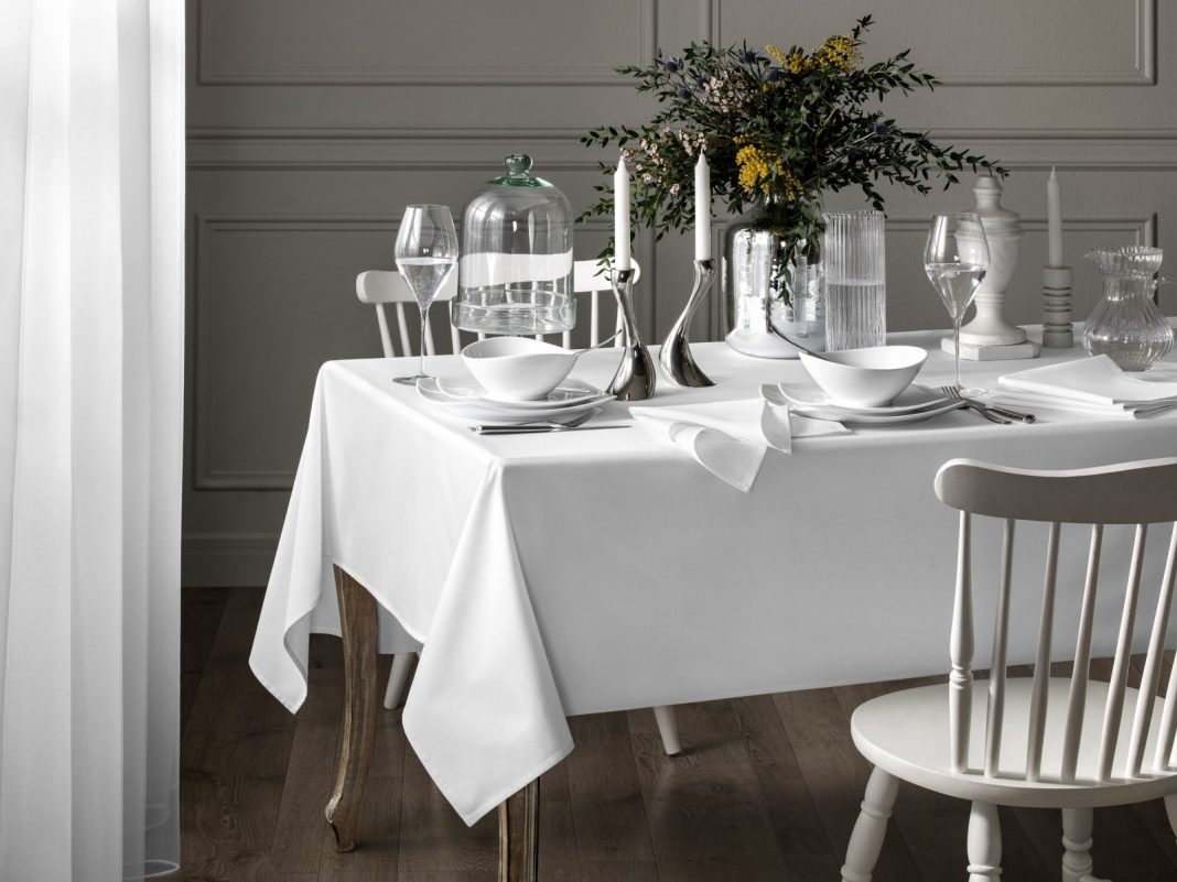 Изящная скатерка – первое, на что падает взгляд, она способна преобразить облик вашей столовой. Для праздничных, торжественных мероприятий идеальна белоснежная скатерка, также хорошо смотрятся традиционные модели пастельных оттенков. Важно обратить внимание и на размер скатерти. Она не должна быть как чересчур длинной, так как чрезмерная длина создает неудобства для гостей за столом, так и слишком короткой: слишком короткое изделие испортит разодетый вид стола. Края скатерти должны свисать примерно на 20-40 сантиметров.
