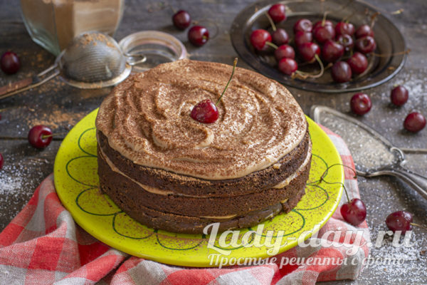 Делаем пропитку – в тёплой кипяченой воде смешиваем растворимый кофе и сахарный песок, наливаем коньяк. Разрезаем простывший шоколадный бисквит на 3 части, кладём на тарелку первый корж, поливаем коньячной пропиткой, затем промазываем корж кремом. Собираем торт.