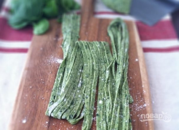 4. Нарежьте острым ножом тесто. Заготовка готова 🙂 Осталось лишь отварить пасту в подсоленной воде и подать к столу. Симпатичного аппетита!