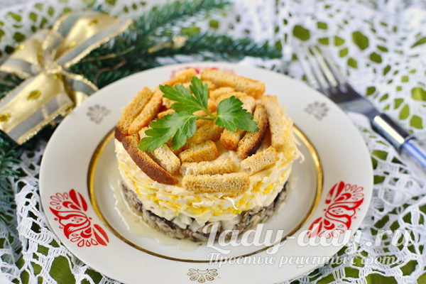 Украшаем слоеную закуску сухарями. Их сушим самостоятельно в духовке или берем покупные, но основное с нейтральным, слабовыраженным вкусом.
