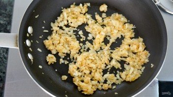 1. В сковороду налейте 1 столовую ложку оливкового масла. Очистите и неглубоко нарежьте 1 луковицу, 2 зубчика чеснока. Обжарьте овощи до готовности.