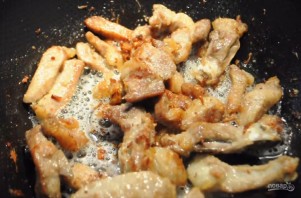 1. Для начала мелко нарежьте чеснок и имбирь, обжарьте их на неплохо разогретом растительном масле (лучше использовать глубокую сковороду или вок). Когда чеснок даст аромат, добавьте нарезанную небольшими кусочками свинину.