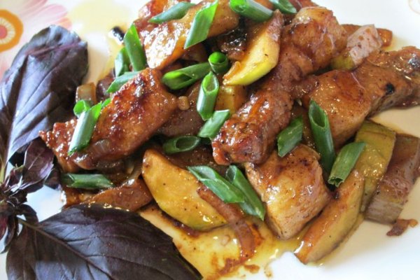 Засыпать их в мясо, обжарить пару-тройку минут, влить соевый соус, повысить нагрев, перемешать и быстро обжарить все вместе до появления карамельного краски, добавить в конце приготовления достаточно много мелко порезанного горестного перца.