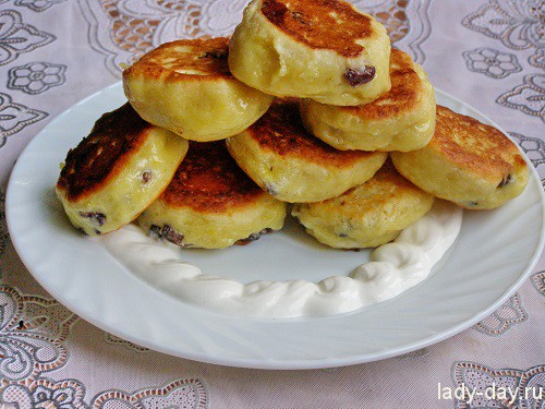 Огонь должен быть очень махонький, иначе с краю сырники с изюмом подгорят, а в середине не пропекутся. Сырники накрываем покрышкой и оставляем пропечься. Как только нижний край зарумянится, пора переворачивать. Обжариваем и с иной стороны.