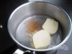 Сливочное масло (125 г) и воду возложите/влейте в кастрюлю. Варите, пока масло не полностью не растопится.