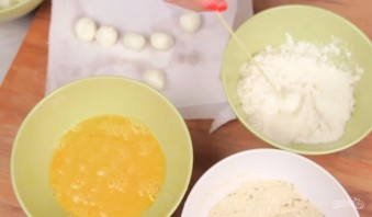 2. Далее взбейте яйцо с помощью миксера или венчика. Шарик моцареллы с поддержкой шпажки или зубочистки окуните в муку, затем — во взбитое яйцо и в панировочные сухари.