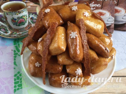 Когда выпечка полностью охладится, заливаем блюдо медовым сиропом, формируем из полосок горку и подаем к столу. Сироп готовится из меда и сахара в соотношении 1 к 1. Симпатичного вам чаепития!