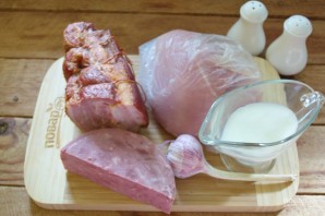 Для приготовления блюда возьмите мясо птицы (можно курицу, а можно индейку), сливки 10%, ветчину, чеснок, специи, бекон.