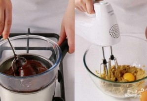 Шоколад разламываем и топим на водяной бане. Заливаем молоком, помешиваем до однородности. Дальше взбиваем сахар и масло, добавляем желтки и остывшую шоколадную массу.