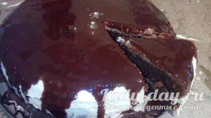 Сразу ставим торт в холодильник, чтобы застыла глазурь. Через 5-6 часов торт целиком пропитается кремом, поэтому можем разрезать его на порционные кусочки и наслаждаться нежным шоколадным вкусом, знакомым с младенчества.