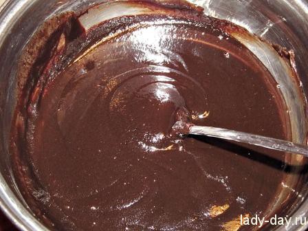 - Приготовить шоколадную полива: растопить на водяной бане шоколад, добавить сливки и сливочное масло. Все тщательно перемешать. Полить поливом весь торт.