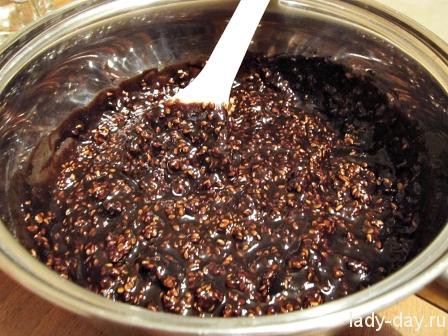 - В растопленный шоколад добавить карамельную кунжутную массу. Неплохо перемешать.
