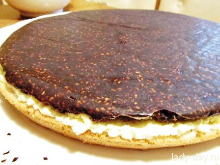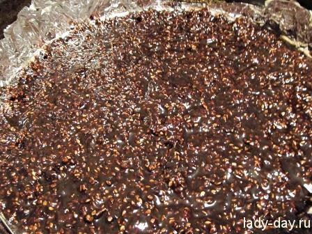 - Осмотрительно отделить от фольги (чтобы не поломать) шоколадно – кунжутную прослойку и возложить сверху на крем.