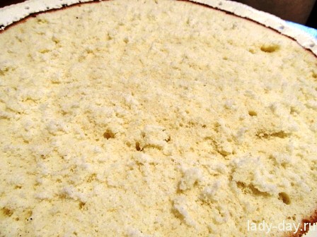 - Бисквитный корж смазать 1/2 крема.