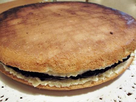 - Бисквитную заготовку разрезать на 2 коржа.
