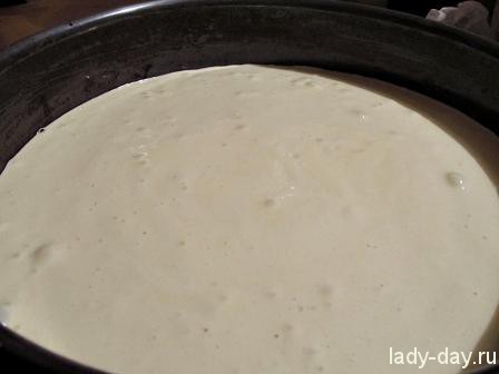- Конфигурацию для выпечки застелить пищевой бумагой. Смазать подсолнечным маслом без аромата. Вылить готовое тесто и разровнять. Поместить в разогретую духовку.