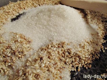 - В кунжут всыпать сахар. Всегда помешивая, довести массу до состояния карамели (3-5 минут). Она должна быть рассыпчатой, но не леденцом.