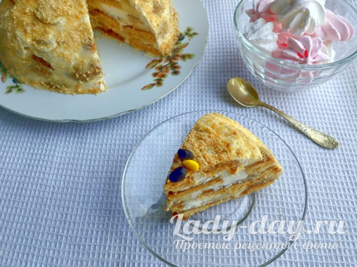 Нарезать изнеженный десерт на порции, заварить свежий чай и устроить пир. Вкус у готового блюда вылит на бисквитный пирог с банановым ароматом и творожным послевкусием. Торт подойдет для семейного чаепития или девичника, и для хозяек, какие не любят долгих приготовлений.
