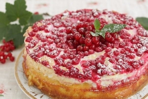 Выпекать творожный пирог с алой смородиной и меренгой полчаса в духовке при температуре 170 градусов.