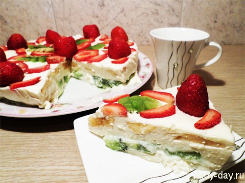 17. Клубнику и киви разрезаете на половинки, четвертушки, колечки, листики (зависит от вашей фантазии), выкладываете их рисунком, стараясь слегка утопить. Торт украшен. Теперь отправляем его не немного чем на 6 часов (лучше на ночь) в холодильник.