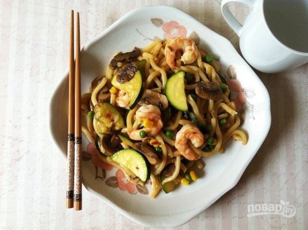 4. Удон подавайте с креветками и овощами. Симпатичного аппетита!