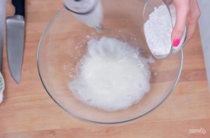 1. Белки изолируете от желтков и с помощью миксера взбейте до состояния пены. Затем добавьте соль, ванилин и продолжайте взбивать, небольшими порциями добавляя сахарную пудру.