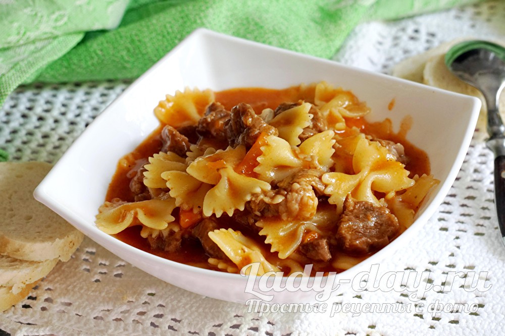 Спустя еще 30 минут выложить в кастрюлю макароны (в данном рецепте используются бантики, которые по желанию можно заменить любыми иными макаронами). По необходимости добавить в кастрюлю с мясом и макаронами воду (нужно чтобы макароны были полностью ей накрыты). Варить еще приблизительно 10 минут до полной готовности макарон.