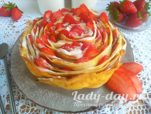 У блинного торта средне сладкий вкус с легкой кислинкой и великолепным клубничным вкусом, со сливочным послевкусием. Дополнить сладкое можно холодным молоком, горячими напитками – чаем или кофе.