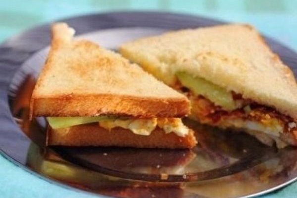 Закуску сервировать вторым кусочком хлеба, также смазанным сливочным маслом. Сэндвич придавить и разрезать на два треугольника, по диагонали. То же самое проделать с оставшимися ингредиентами.